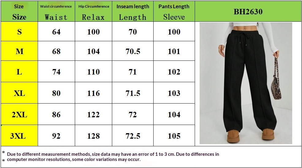 Product information: Color: Black Sizes: S, M, L, XL, XXL, XXXL Style Category: Japanese and Korean Casual Fashion Element: Solid Color Fabric Name: Polyester Main Fabric Composition: Polyester Suitable Gender: Female Pants Style: Wide-leg Pants Note: 1. Asian sizes are 1 to 2 sizes smaller than European and American people....