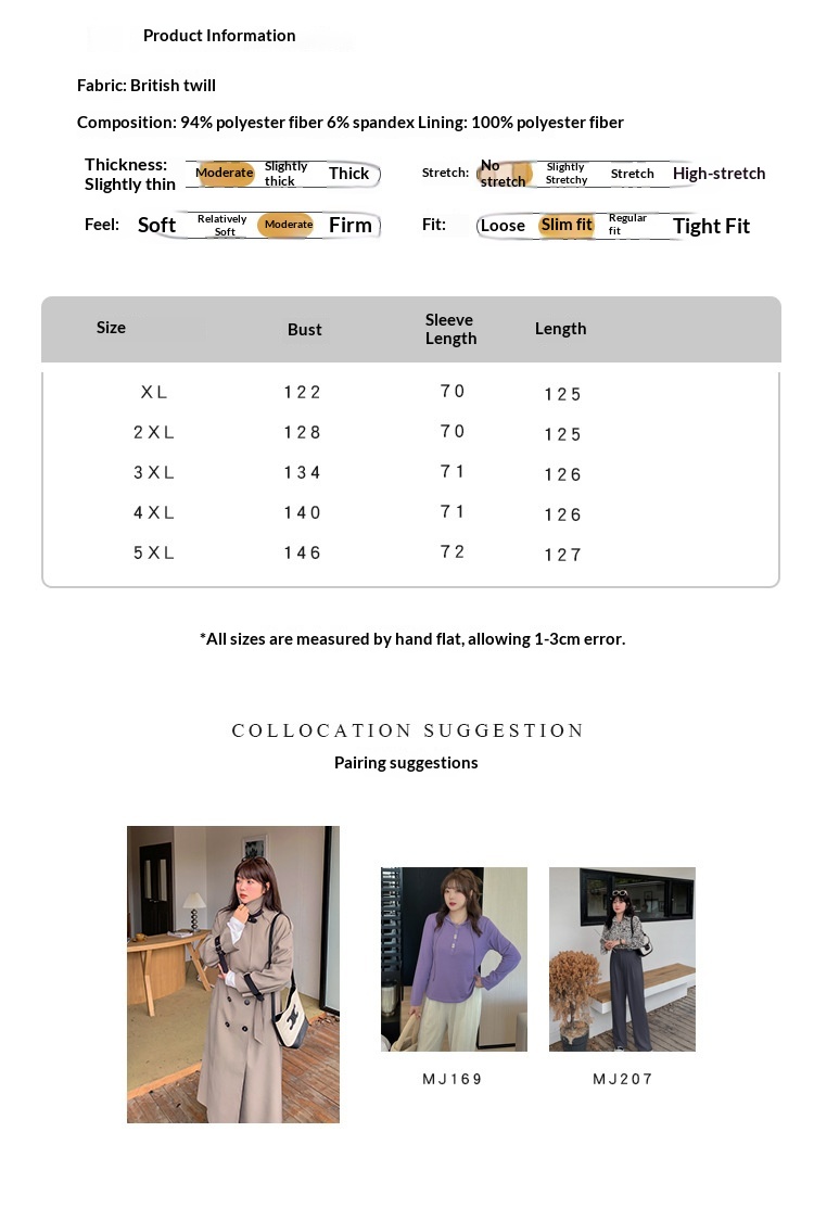 Product information: Pattern: Solid color Color: Mocha Coffee, Creamy Apricot Sizes: XL, XXL, XXXL, 4XL, 5XL Fit: Straight fit Style Category: Elegant Commuter Fashion Element: Pockets Thickness: Medium Sleeve Style: Regular sleeves Main Fabric Composition: Polyester Length: Extra-long (length > 100 cm) Gender: Women Applicable Age Group: Adult Sleeve Length:...